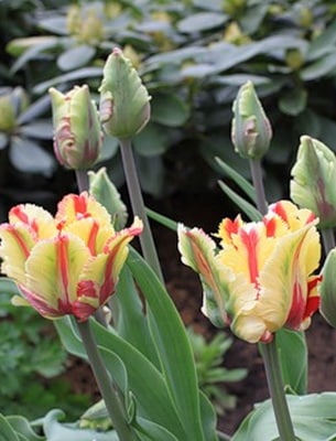Известны с XVII века. Лепестки околоцветника глубоко изрезаны по краям. Окраска преимущественно трёх цветов: жёлтая, зеленая и красная, как у попугаев.